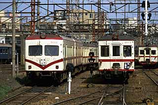 京福電鉄(福井鉄道部)は、越前ガニで有名な東尋坊や越前海岸に芦原温泉、永平寺の観光拠点と、県庁所在地福井市を結ぶ59.2kmの路線網を有し、福井県を代表する私鉄である。 車両に関しては、以前から大手私鉄からの購入車が中心を占め、旧南海の車両に旧阪神ジェットカーの車体をうまく2扉化改造した車両など、関西出身の私にとっては非常に馴染み深い。 日本最古参の機関車テキ6等を始め貴重な車両が多いが、厳しい経営状況に加え、周知の通り、'00年と'01年に連続した大事故により営業休止に至った。その存続は絶望視されていたが、第三セクター「えちぜん鉄道」に引き継がれ、'03年より営業運行を再開した。 ('74年8月の様子は下記をご覧下さい) "京福電鉄−74年8月" "京福電鉄−74年8月・電気機関車" |